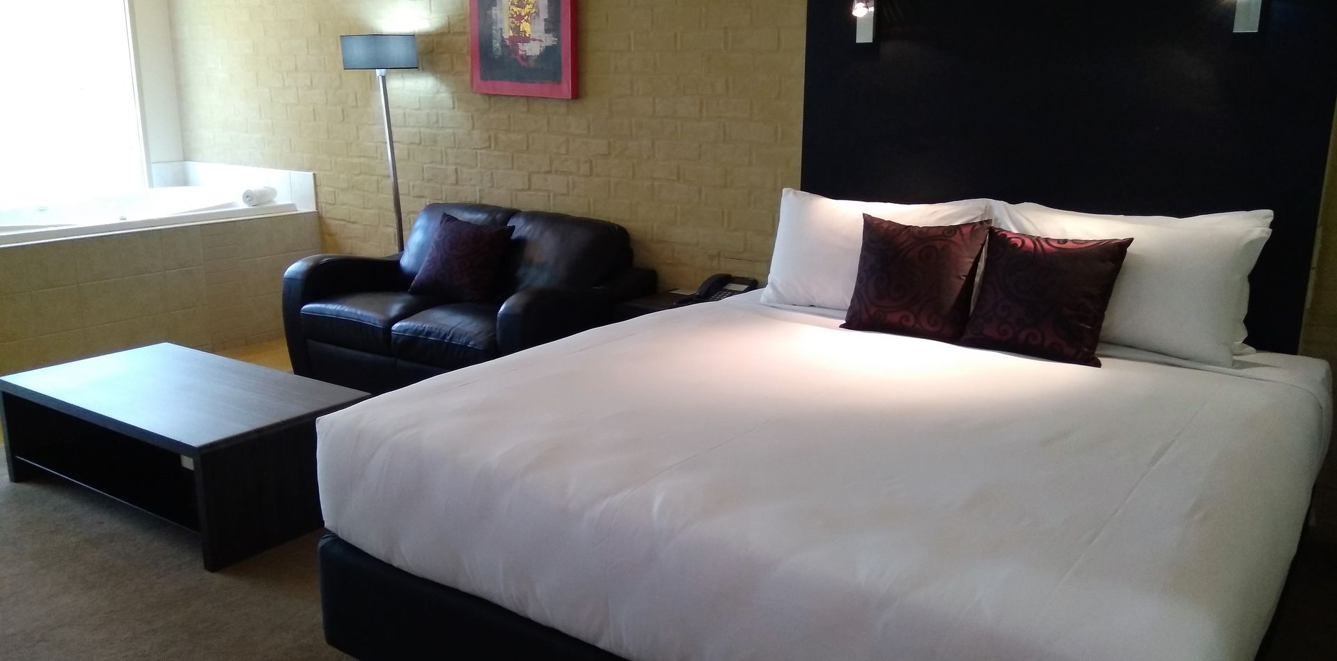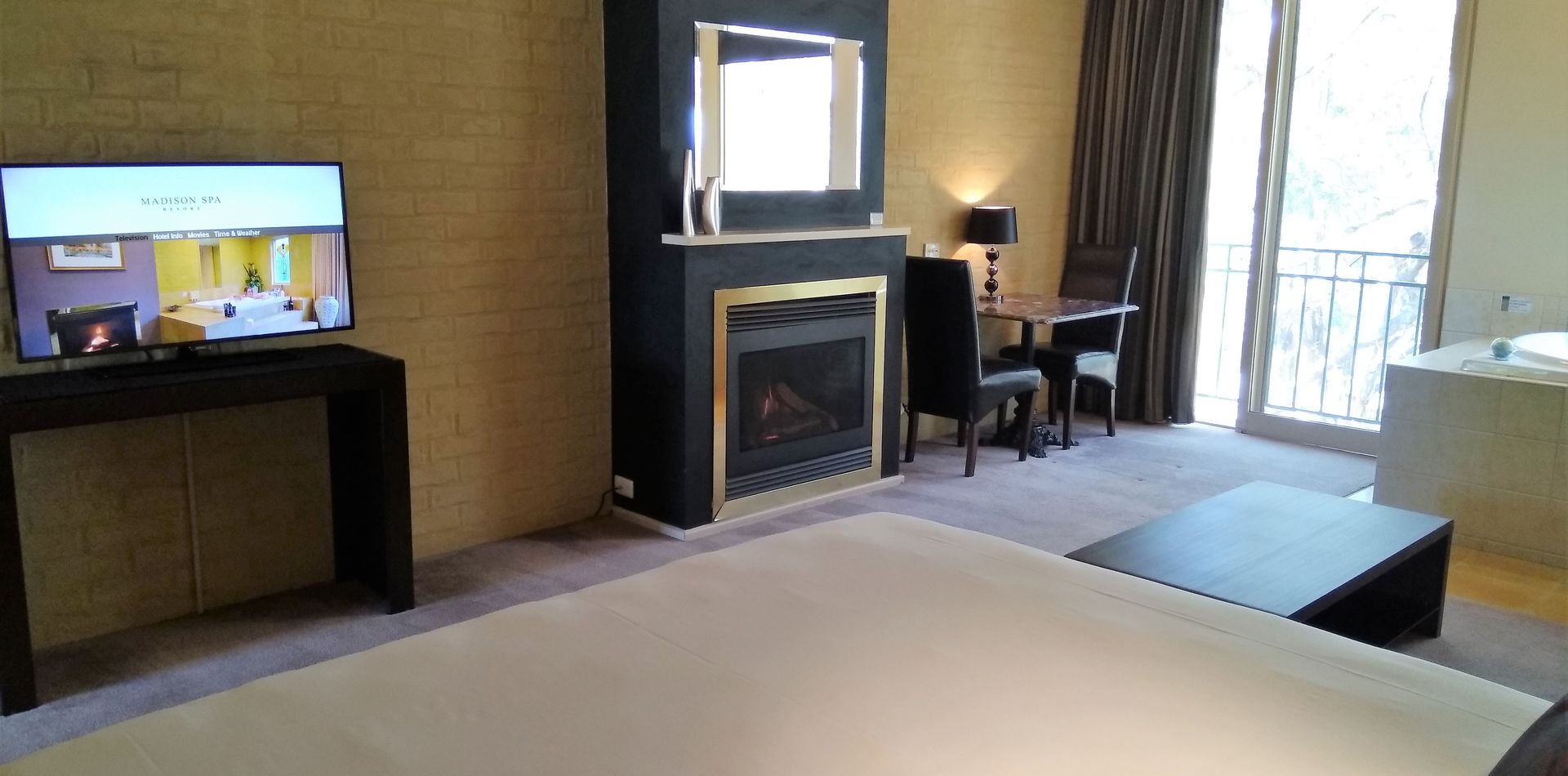 Located on the 1st floor, this room boasts lovely bush land views and a 2-person spa bath overlooking the treetops. The spacious, air-conditioned room features a gas log fireplace, a 40-inch flat-screen TV, a coffee table and a pillow top king bed for extra comfort.